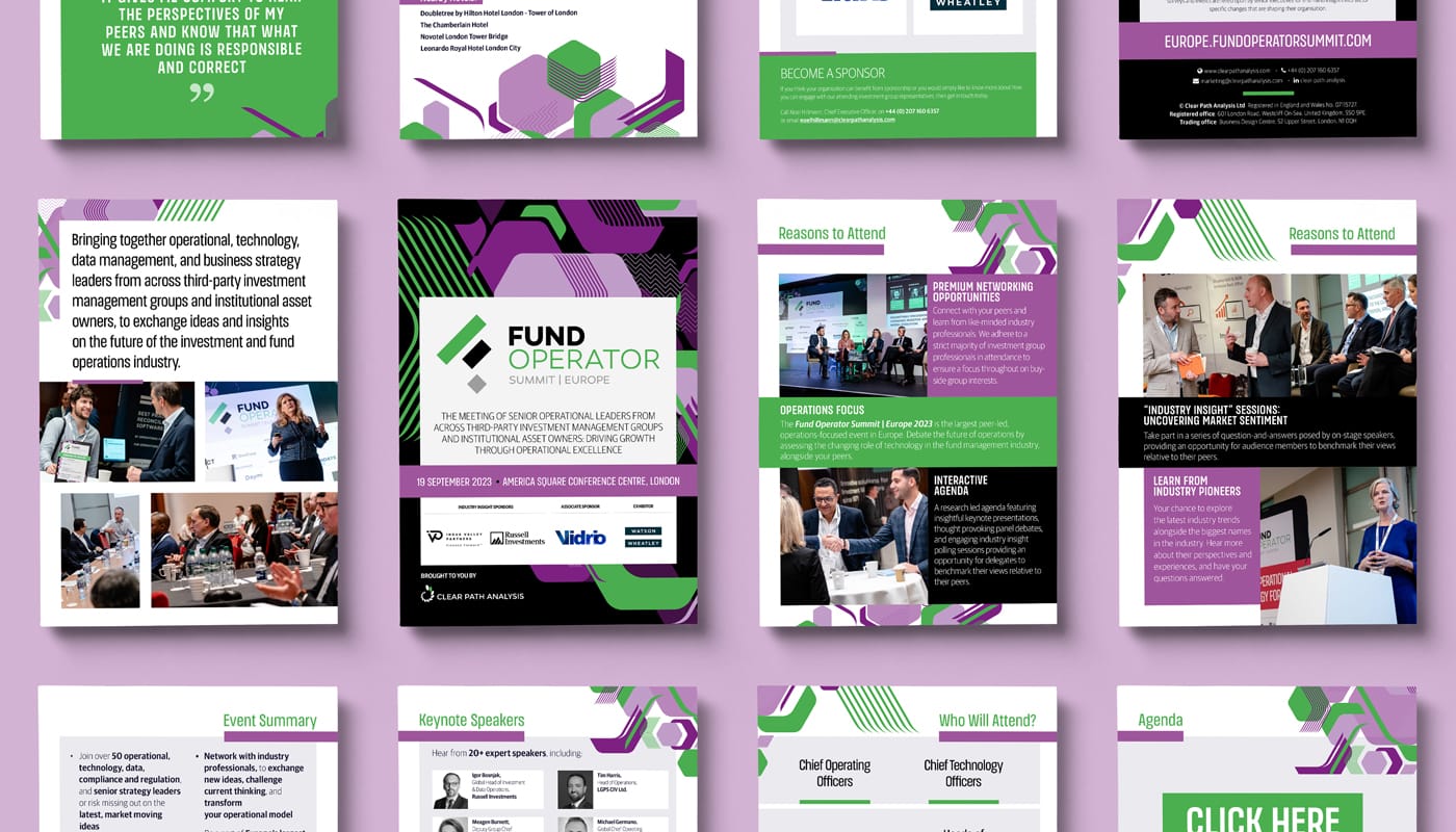 Over the last decade, our collaboration with Clear Path Analysis has embraced a range of deliverables, focusing primarily on peer-to-peer reports and event marketing design. This finance sector niche player has set a benchmark by offering unique insights to finance professionals, free of charge. Acknowledging the substantial readership, our initial step involved revamping their marketing collateral, instilling it with a clean, sleek, and professional appearance. This transformative process streamlined our ability to produce multiple reports monthly. Varying from 20 to 50 pages and featuring interviews, whitepapers, and roundtable discussions.